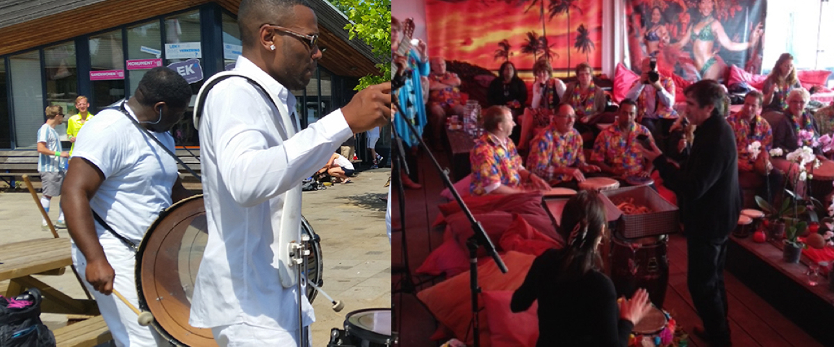 De dames krijgen een samba hoofdtooi en de mannen een drum.